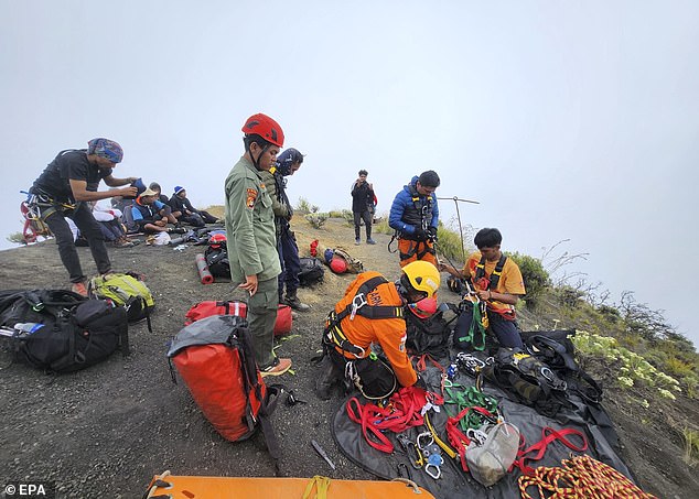 A handout photo from Indonesia’s Search and Rescue Agency (BASARNAS) shows rescuers preparing for a rescue operation for a Brazilian tourist who fell while hiking Mount Rinjani on Lombok Island, West Nusa Tenggara Province, Indonesia, June 24, 2025.