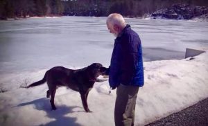 Once they reached the edge of the lake, Derik continued walking onto the frozen waters with Badger alongside him. It was there that he lost his balance suddenly and fell hard on the ice. According to Purina Canada’s website, Derik tried to get up on his own, but could not bring himself to his feet and was panicking and in shock. Severe pain shot up his entire leg. It was discovered later that the pain was a result of his leg being broken in two places along with a ruptured tendon – essentially crippling him on the ice with no one in sight.